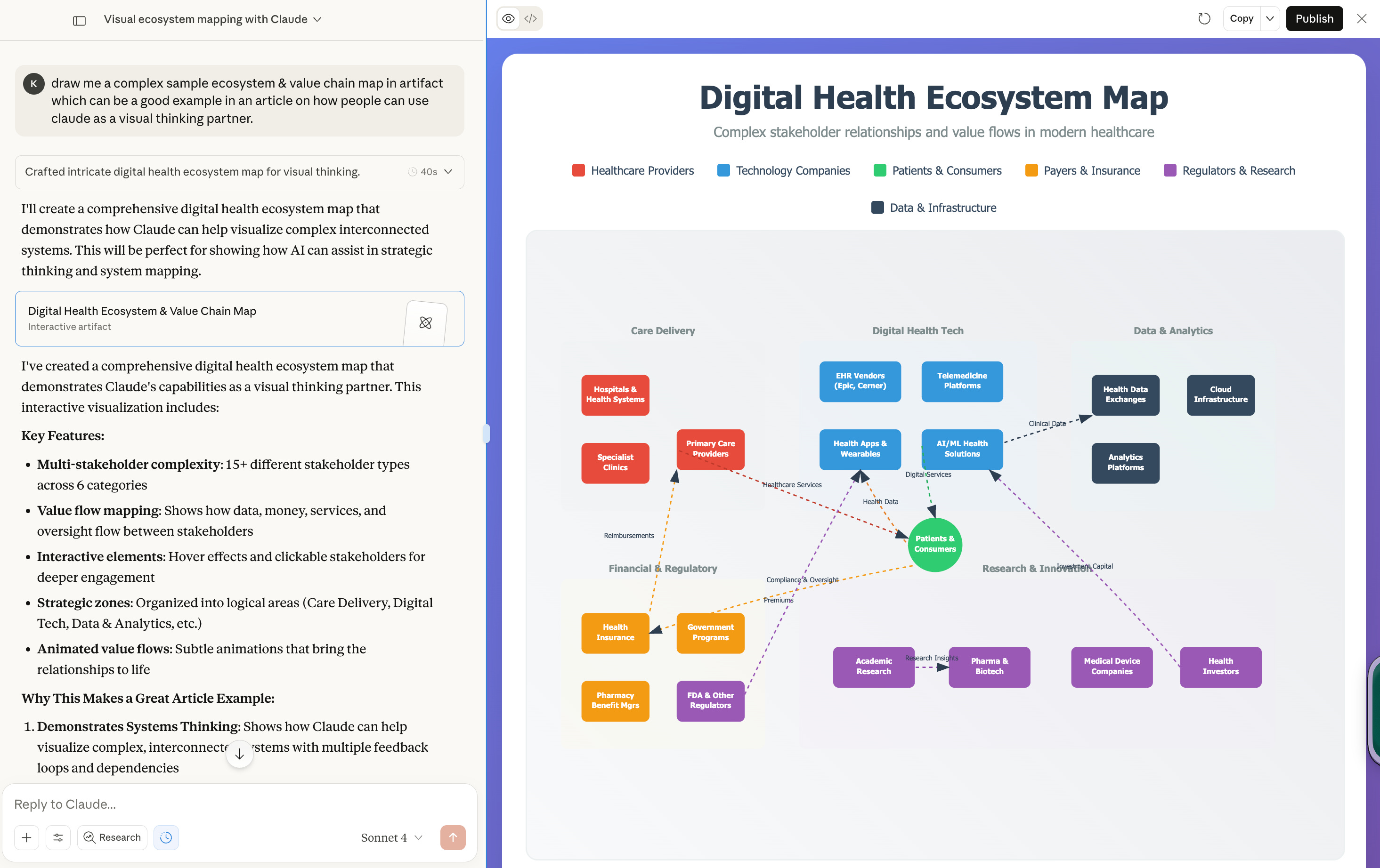 For visual thinking, I use the Artifact function, which helps me quickly understand complex topics or build 1.0 foundations. This could be a stakeholder map, a customer journey, or any visual diagram that supports my thinking. Sometimes I process post-meeting notes this way, or deep research results, if I want to better understand how a sector works, for example.