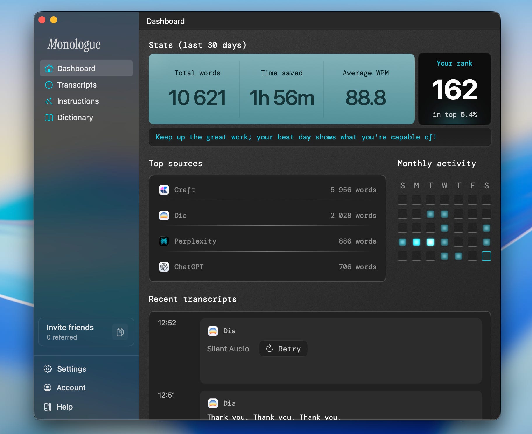 I’ll start with my latest favorite, Monologue. Monologue is more of a supporting tool that runs in the background, yet it’s significantly sped up how I work and how I use my computer.